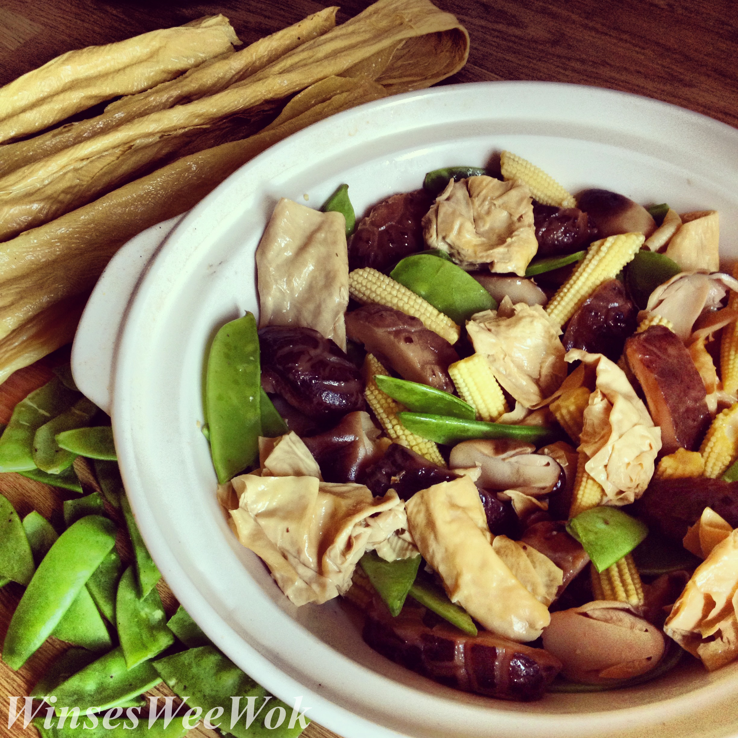 • Heat a clay pot on medium/high settings. Add oil, once hot add the slice of ginger and fry for 10 seconds. Throw in all the vegetables except the mange tout. Add in all the mushrooms and the tofu stick pieces. Stir fry for 20 seconds.