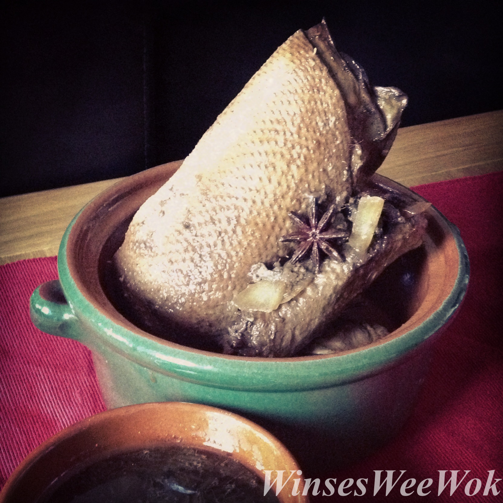 • Place the duck into the pot. Cover with lid and braise on a medium heat for 40 minutes. Reduce to a simmer for 1 hour. Cut the duck and pour some liquid into a dipping bowl. Serve.