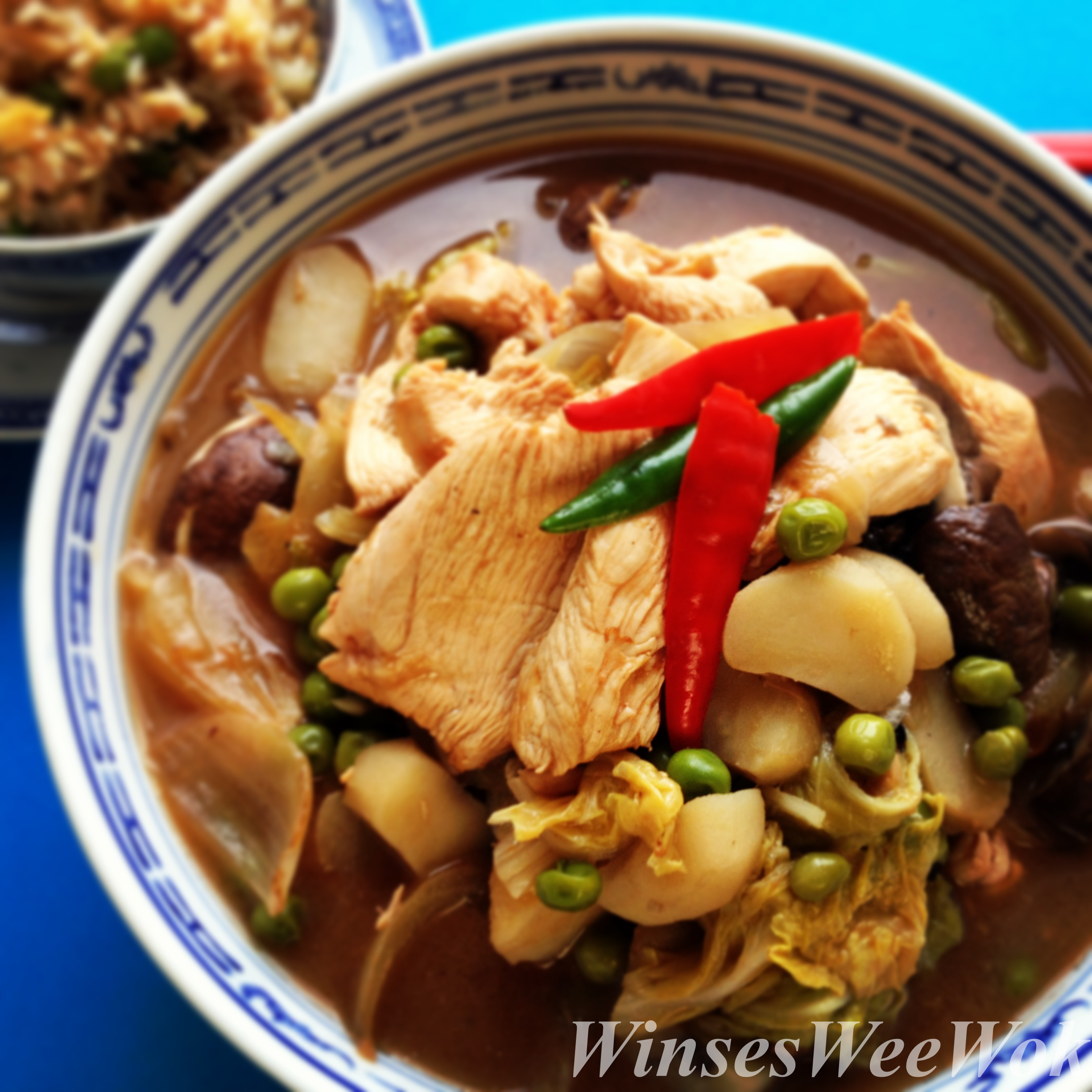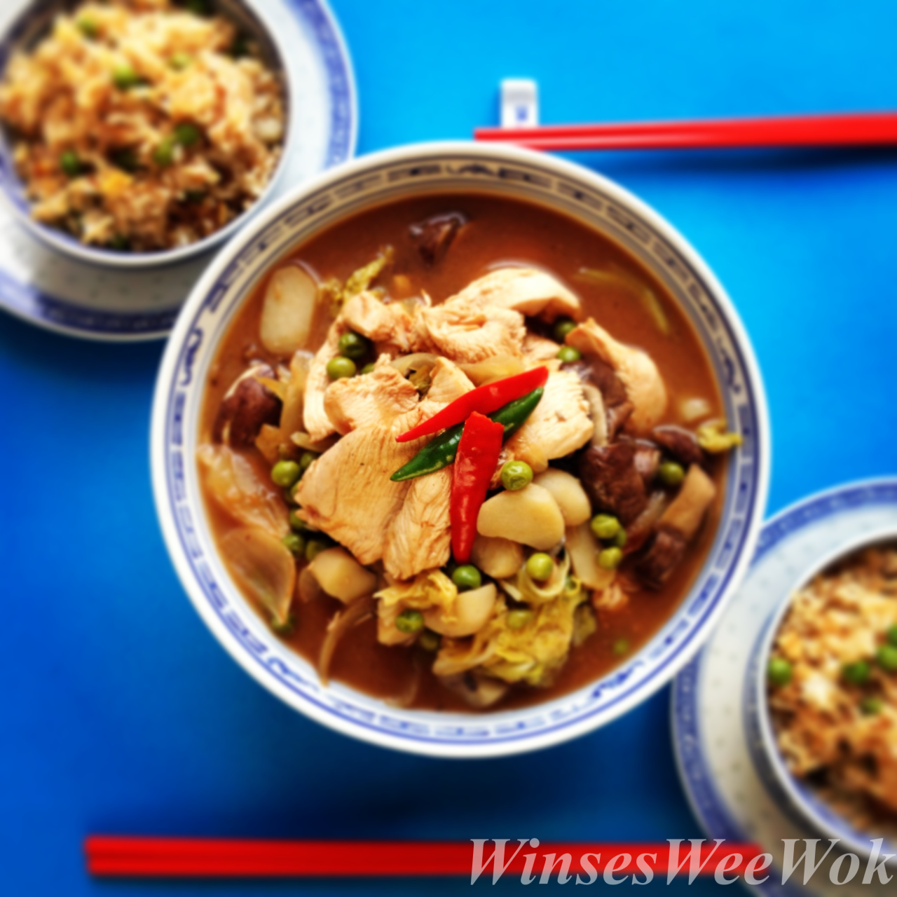 • Add mushrooms, cabbage, snow peas and chestnuts. Mix well, boil for 5 minutes with lid on. Mix thickening ingredients together and add into the wok. Cook for 1-2 minutes with the lid off. Serve.