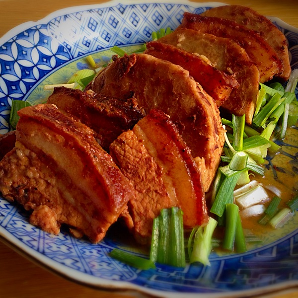 • Shallow fry the whole pork belly, skin side down until the skin turns golden brown. Shallow fry the meat until they turn a slight charred brown. Set aside to cool before cutting into ½ inch in thickness.
