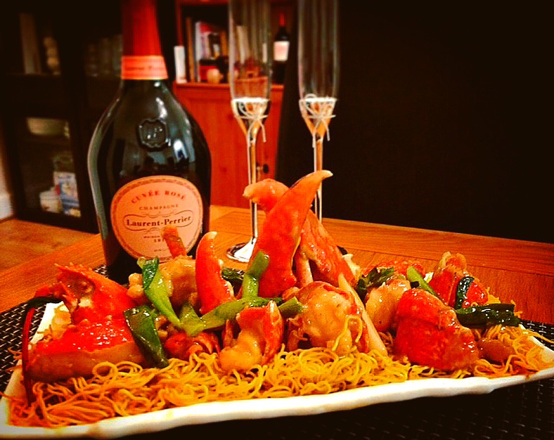 - If using deep fried noodles– bring a wok to a high heat, once hot, add a litre of oil. Boil till the oil starts to smoke a little. Carefully add the rinsed and very well drained noodles into the hot oil. With a spatula or chopsticks, gently press the noodles into the oil. Cook for 30 seconds. Drain onto kitchen paper. Transfer the noodles onto a large plate. Pour lobster pieces and its sauce over the noodles. Enjoy!