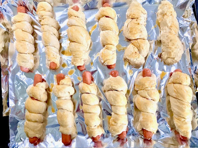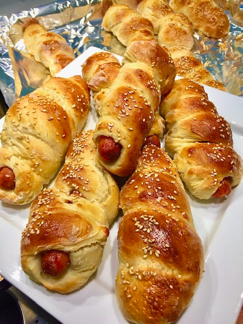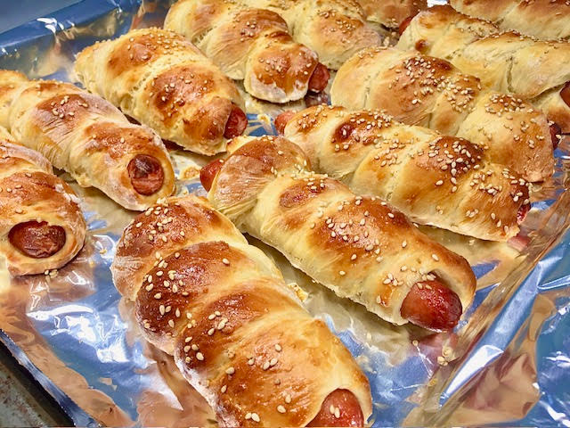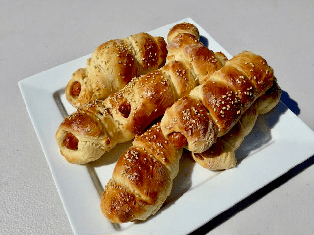 (For a spiral look, roll the dough into a long rope and wrap it around the sausage.) - Place on parchment-lined baking tray with seam side down.
