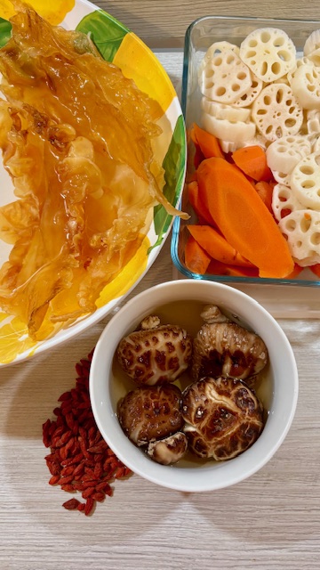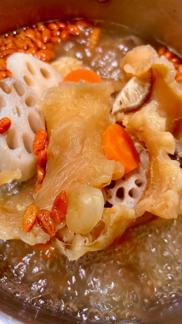 Pop in your lotus root, carrots, shiitake mushrooms, and your beautifully soaked fish maw.