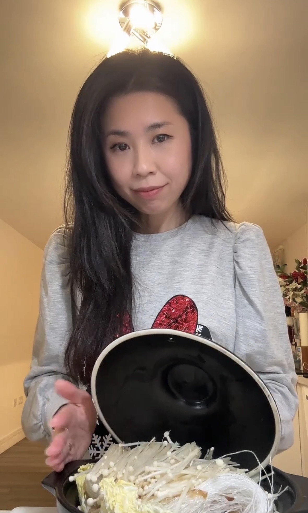 - Layer enoki mushrooms on top — trust the process.